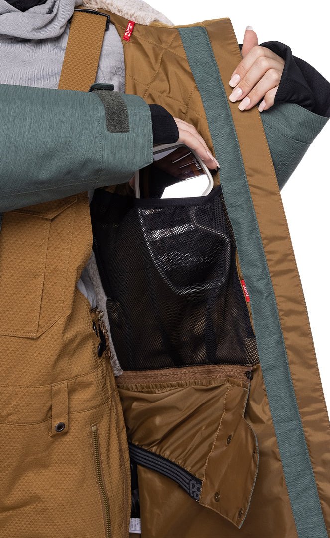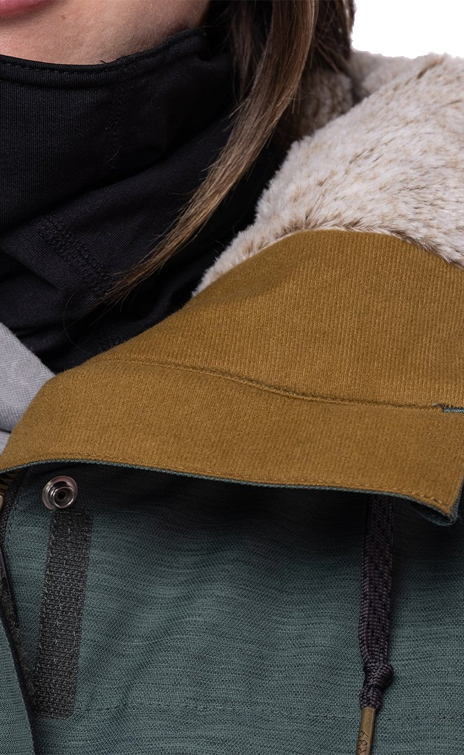 Construction : Tissu 2 couches extensible infiDRY® 10K ajout d'un traitement déperlant DWR, Poignet réglable en velcro Death Grip?, Ventilations Air-Flo? doublées de maille sous les bras, Jupe pare-poudre réglable attachée, Tirette de fermeture éclair perlée sur la poche de poitrine, Col intérieur en fausse fourrure, Doublure en fausse fourrure et capuche doublée en satin, Isolation infiLOFT® 40g pour le corps et les manches, Fermetures à glissière YKK® Metaluxe au centre de la poche avant et de la poche poitrine
