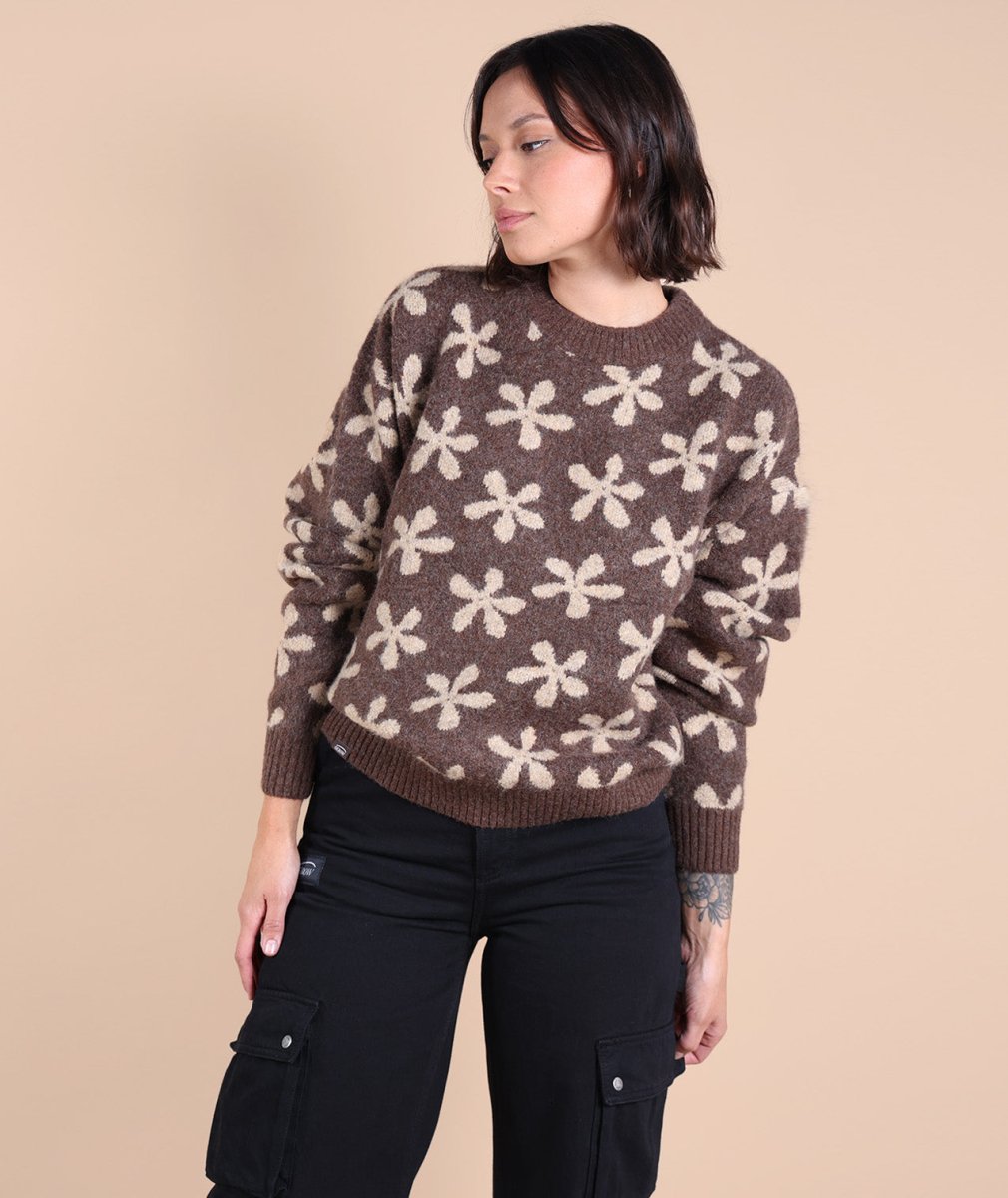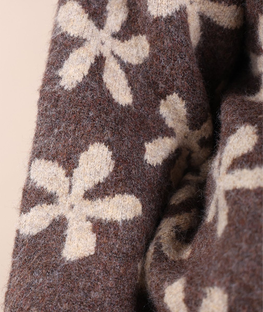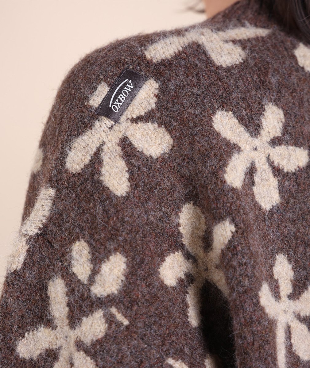 Sa maille jacquard fleurs apporte une touche raffinée, tandis que sa texture chaude et moelleuse enveloppe délicatement. Grâce à sa coupe confort et son col rond intemporel, il se porte facilement au quotidien, du bureau aux soirées cocooning !