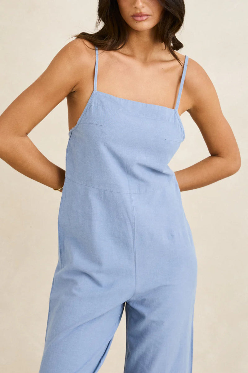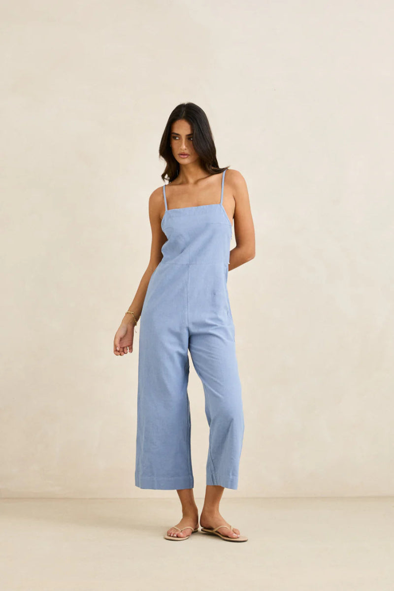 La Classic Jumpsuit en coloris Steel Blue allie style et confort. Confectionnée en mélange rayonne et lin 60/40 %, cette combinaison à décolleté droit style tablier et bretelles réglables offre une coupe ample et flatteuse avec un bas large. Le détail dos nu apporte une touche féminine, complété par l’étiquette Classics à l’arrière de la taille pour un look élégant et contemporain.