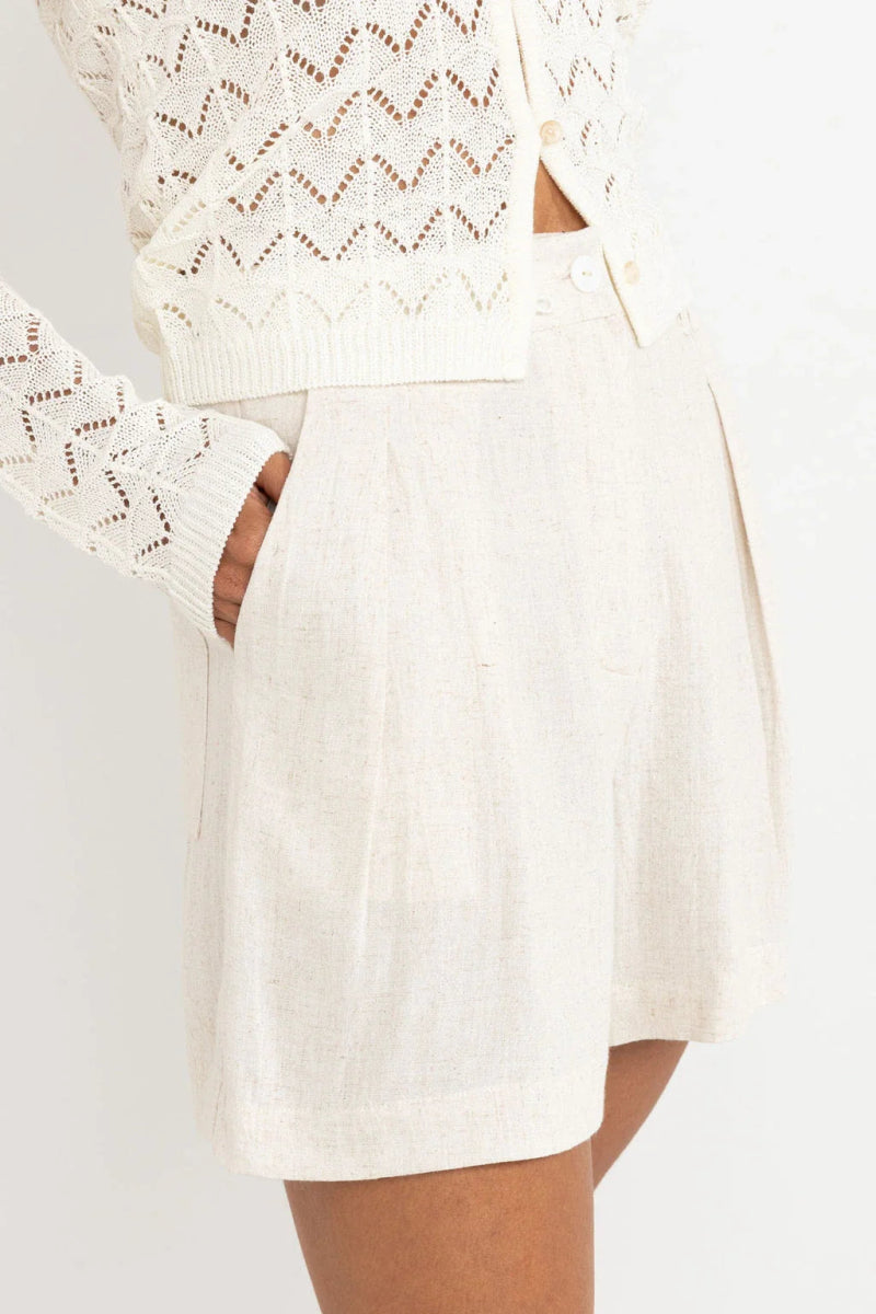 Le Ocean Short en coloris Oat combine élégance et confort pour les journées estivales. Confectionné en 70 % rayonne et 30 % lin, il offre une texture légère et respirante. Sa silhouette A-line à taille haute flatte la silhouette, tandis que les plis sur le devant, la fermeture zippée avec bouton et les passants de ceinture ajoutent une finition soignée, idéale pour un look estival raffiné et décontracté.