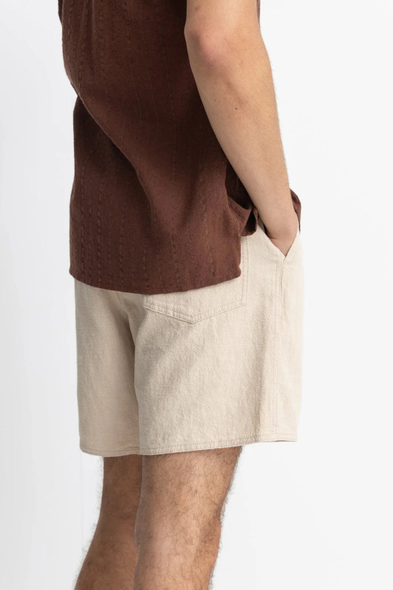 Adoptez le style estival avec le short homme Box Textured Jam de chez Rhythm. Conçu dans une matière texturée légère au coloris Natural (beige clair effet lin), il offre un confort optimal et un look surfwear minimaliste. Sa coupe décontractée mi-cuisse et sa taille élastique à cordon en font un indispensable aussi bien pour la plage que pour la ville.