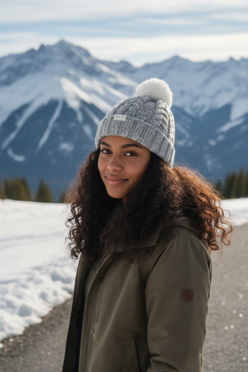 - Details: twisted knit, folded cuff, decorative pom-pom