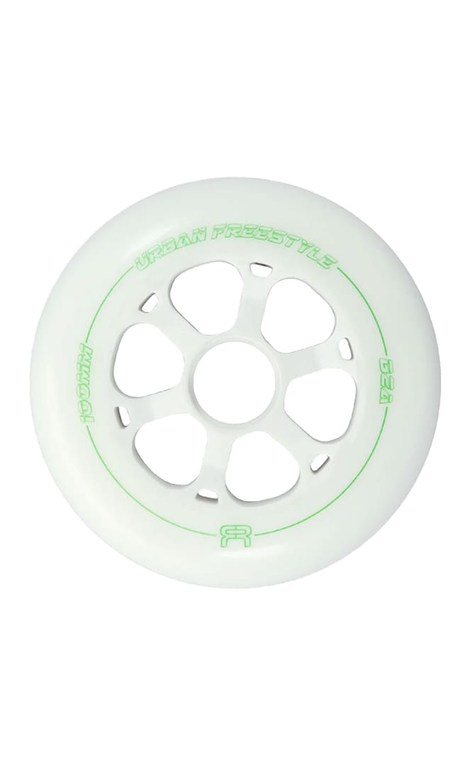 The FR Urban Freestyle 100mm/82A - White wheels offer a better shock absorption thanks to their hardness of 82A, perfect for dynamic movements in slalom practice. Great for varied use on different surfaces, from smooth gym floors to rougher outdoor surfaces!