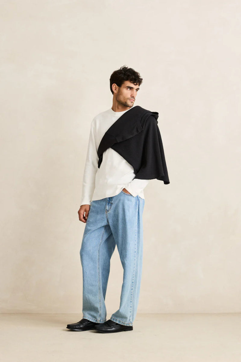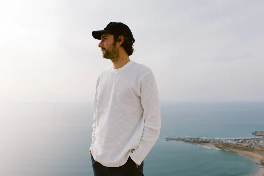 The Classic Waffle Knit in Vintage White revisits a timeless workwear style with a modern touch. Made from a waffle knit blend of cotton and polyester, it offers a warm and breathable texture ideal for mid-season. Its comfortable fit and medium weight make it a perfect piece for layering your outfits on cool days.