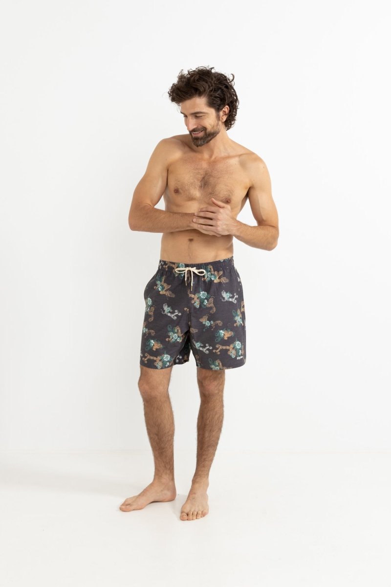 The Pollen Beach Short in color Black combines style and practicality for summer days. Made from a stretchy fabric blending recycled polyester (35 %), polyester (38 %), cotton (21 %), and spandex (6 %), it offers lightness, comfort, and durability. Its outer length of 17” (43 cm) and relaxed fit ensure optimal freedom of movement. Its seasonal print, elastic waistband with polyester drawstring, and back pocket with flap make it a functional piece with a bold look.