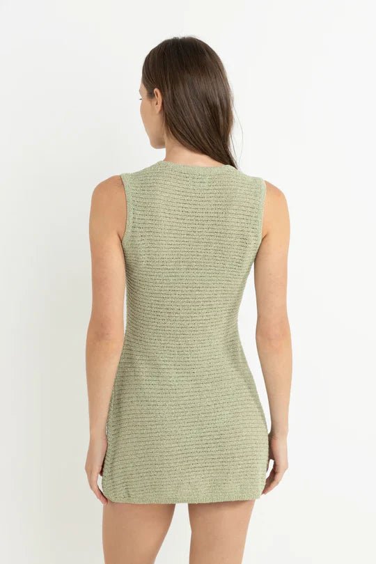 The Abby Knit Tank Dress in the color Fern combines comfort and minimalist elegance. Made from a soft blend of polyester (60 %) and acrylic (40 %), this short dress sleeveless features a fitted top with a high collar and a flared skirt for a feminine and contemporary look. Its open knit adds a touch of lightness perfect for sunny days or summer evenings.