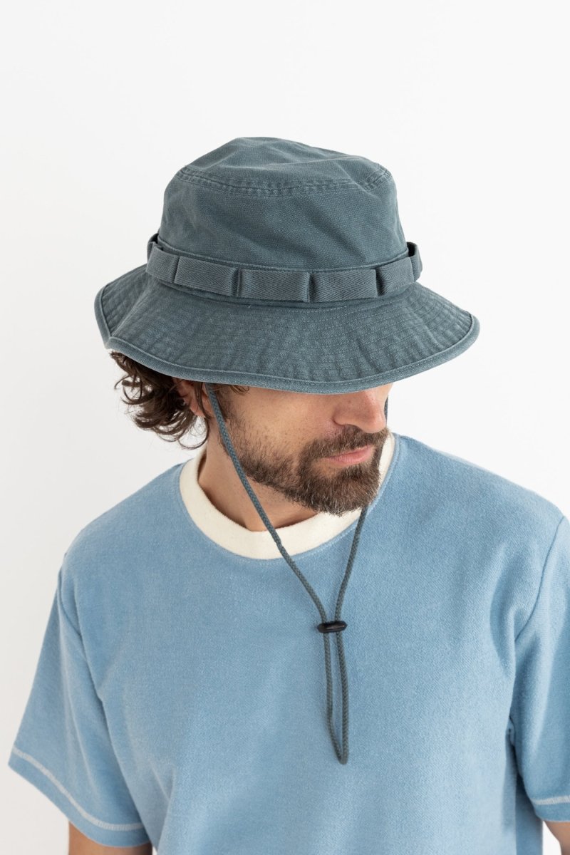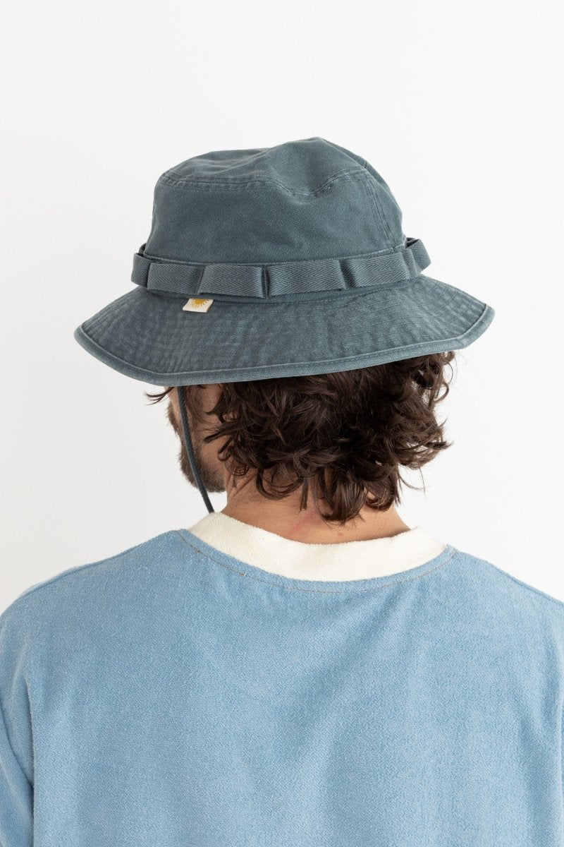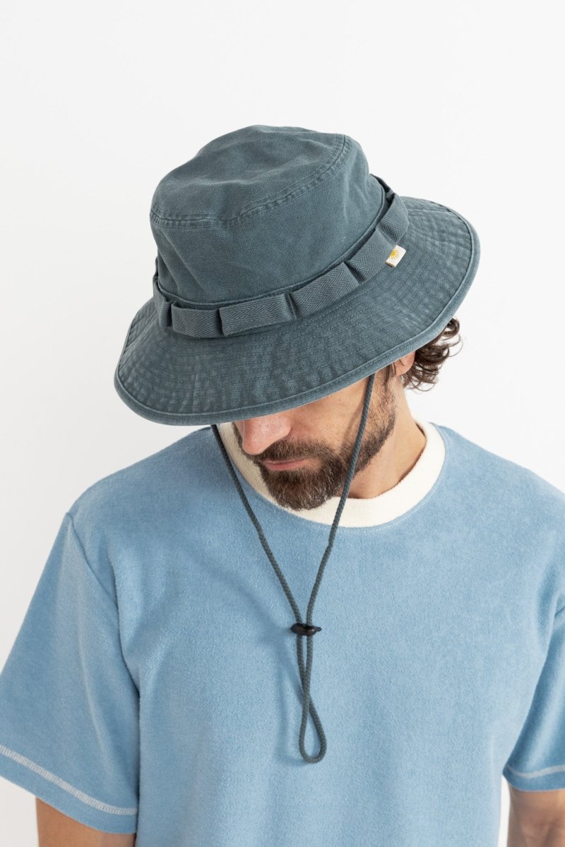 Enjoy the outdoors in style with the Worn Path Boonie in Silver Pine from Rhythm. Made from 100% cotton canvas, this sturdy hat offers a wide structured brim for optimal sun protection and an adjustable strap under the chin for a secure fit. The loop detail around the crown adds a rustic touch, while the signature Rhythm labels and finishes ensure quality and authenticity.