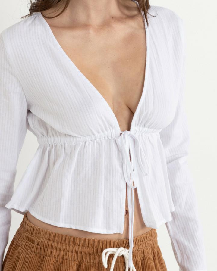 Aporta un toque femenino y relajado a tus outfits con el Belle Tie Front Long Sleeve Top en White de Rhythm. Este top de mujer en 100% algodón combina ligereza y comodidad. Su corte fluido, su escote en V y su cinta ajustable en la parte delantera aportan un aire elegante y versátil. Gracias a su cordón debajo del pecho, se ajusta fácilmente para un caído personalizado, ideal para un look casual chic diario.