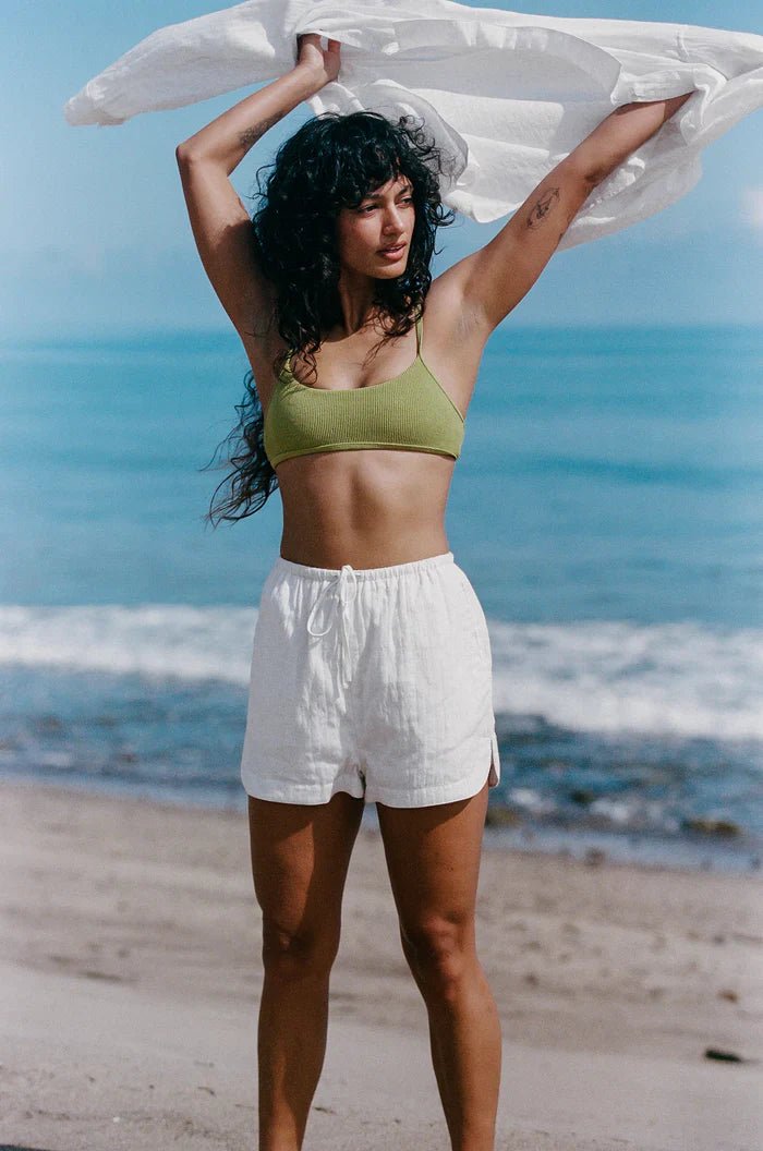 Adotta uno stile estivo leggero e comodo con i Textured Overswim Shorts in Off White. Questi shorts overswim leggeri sono realizzati in un tessuto testurizzato alla moda. Hanno una vita elastica morbida e un cordino regolabile davanti per un fit personalizzato. Perfetti da indossare in sovrapposizione con i costumi da bagno della capsule di maggio, questi shorts incarnano l'eleganza informale di un'estate nostalgica.