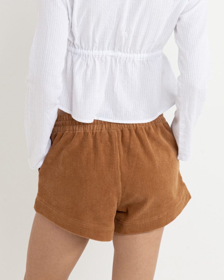 Short côtelé marron en coton, taille élastique avec cordon contrasté, coupe décontractée idéale pour les journées d’été au bord de la mer.