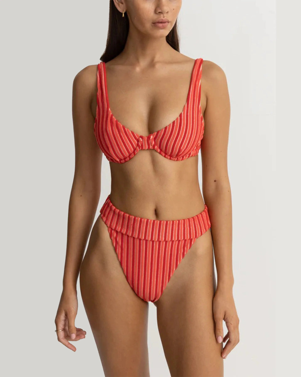 Alliant confort moderne et charme vintage, le Terry Sands Stripe Underwire Top en Cocoa est un haut de maillot pensé pour sublimer la silhouette. Confectionné dans un tissu éponge rayé rouge bicolore, il assure un style à la fois rétro et tendance. Son armature intégrée garantit un maintien optimal, tandis que ses bretelles réglables et son attache dos ajustable offrent un ajustement parfait. À associer avec le bas assorti Terry Sands ou à mixer avec d’autres pièces de la collection.
